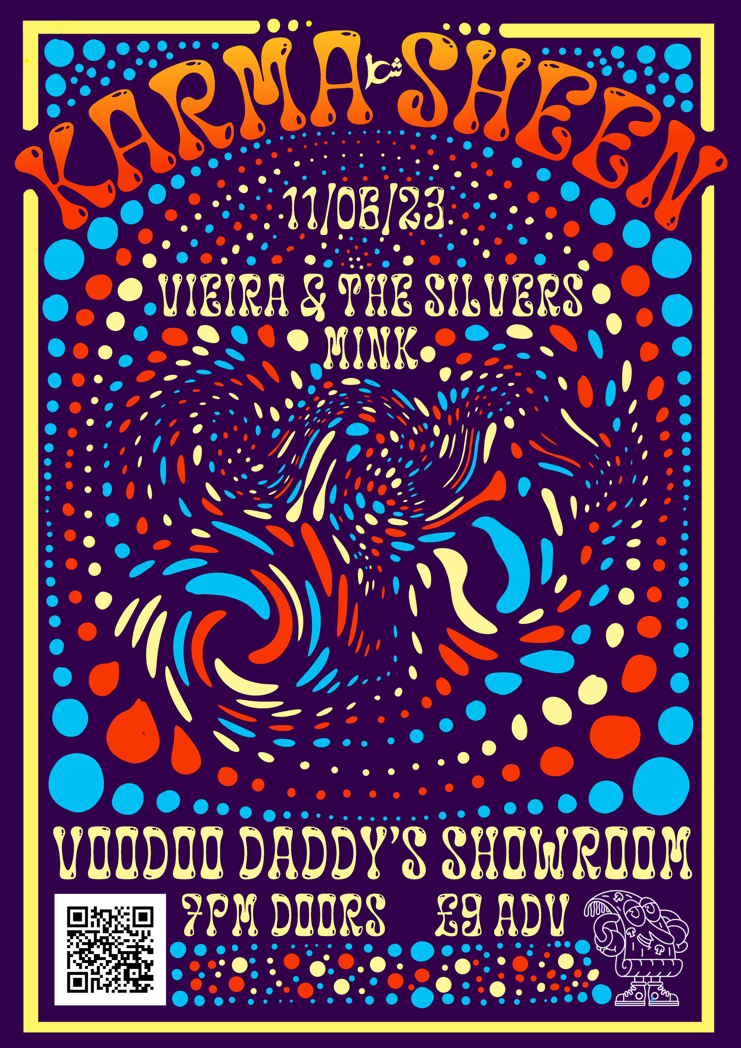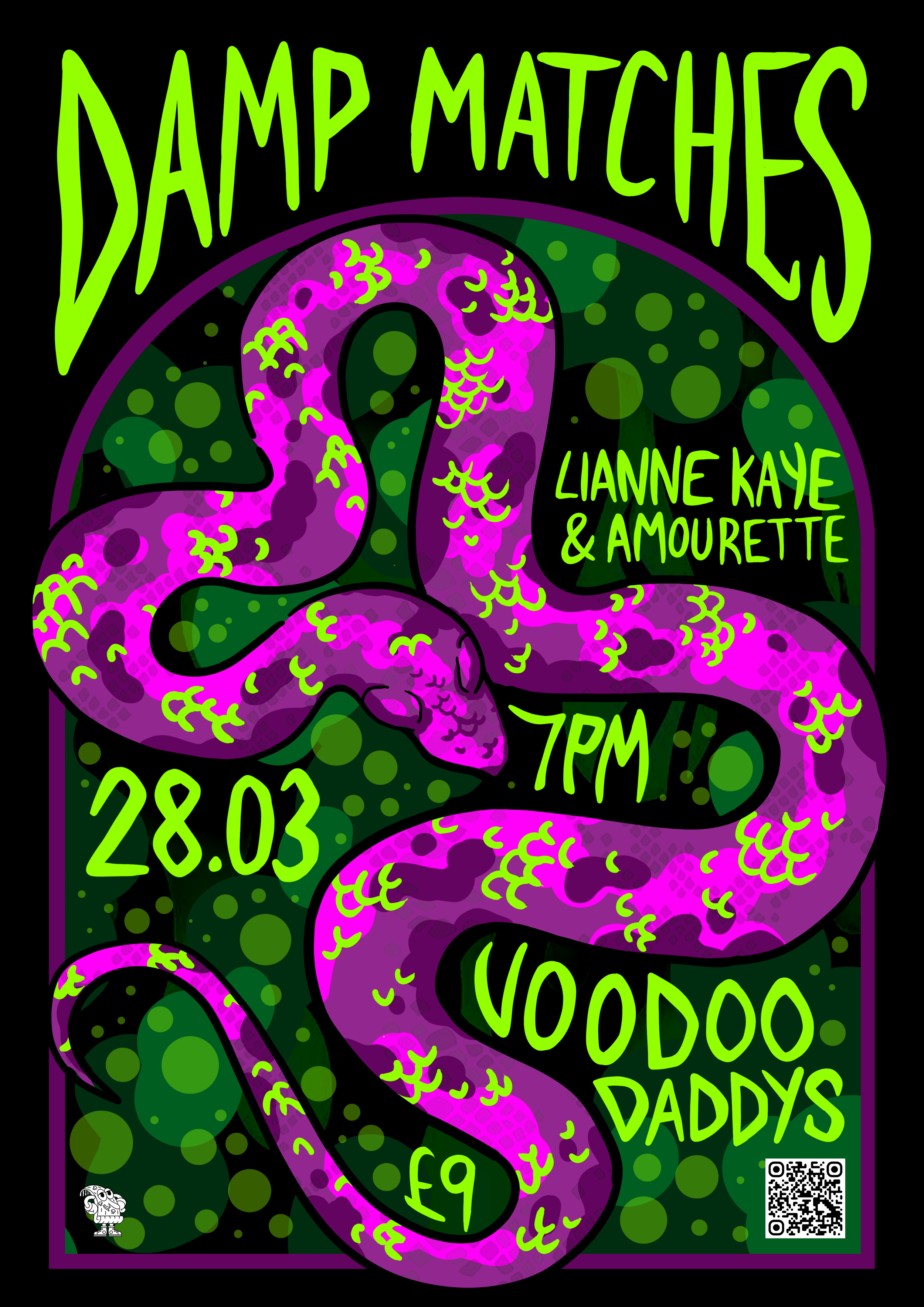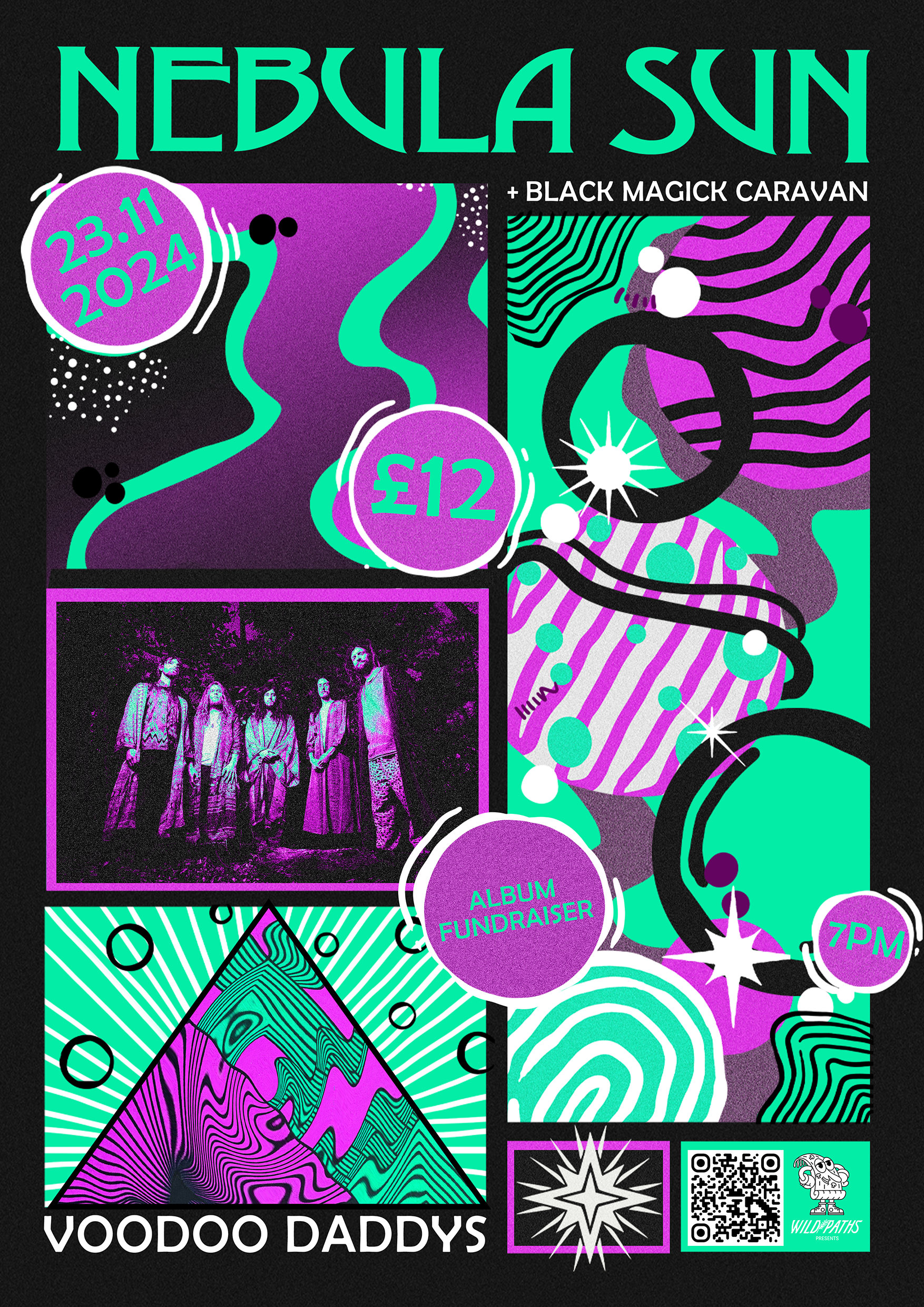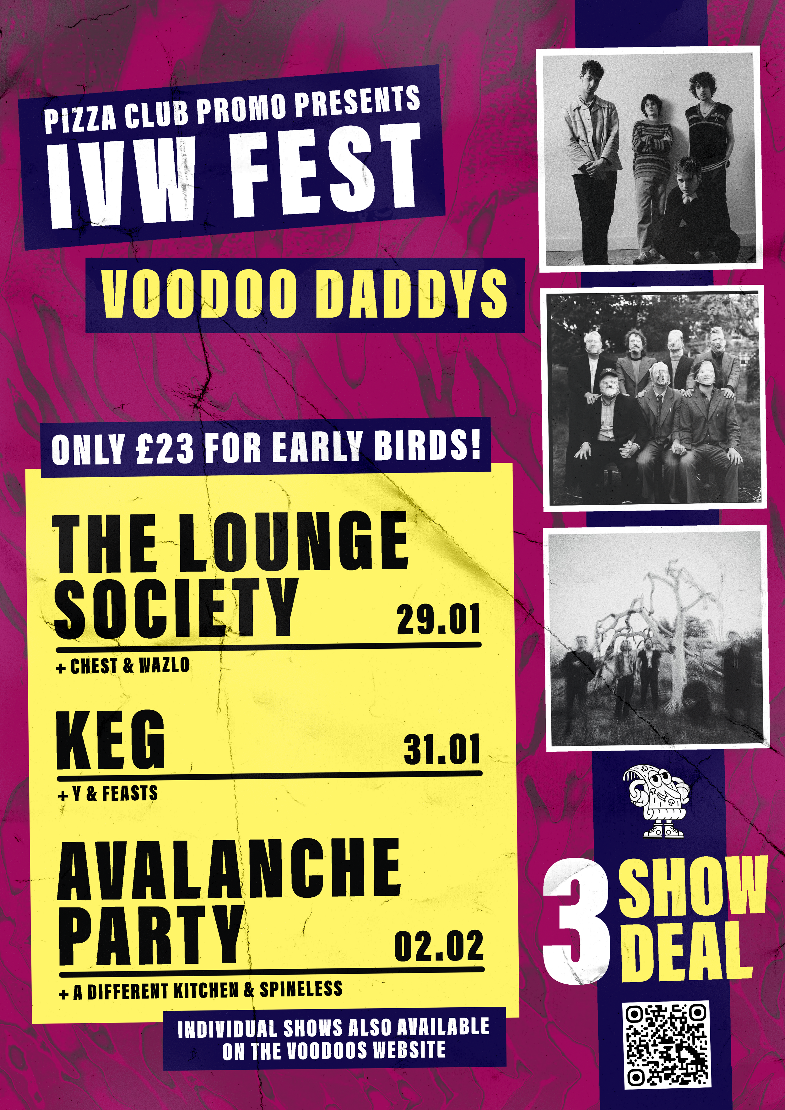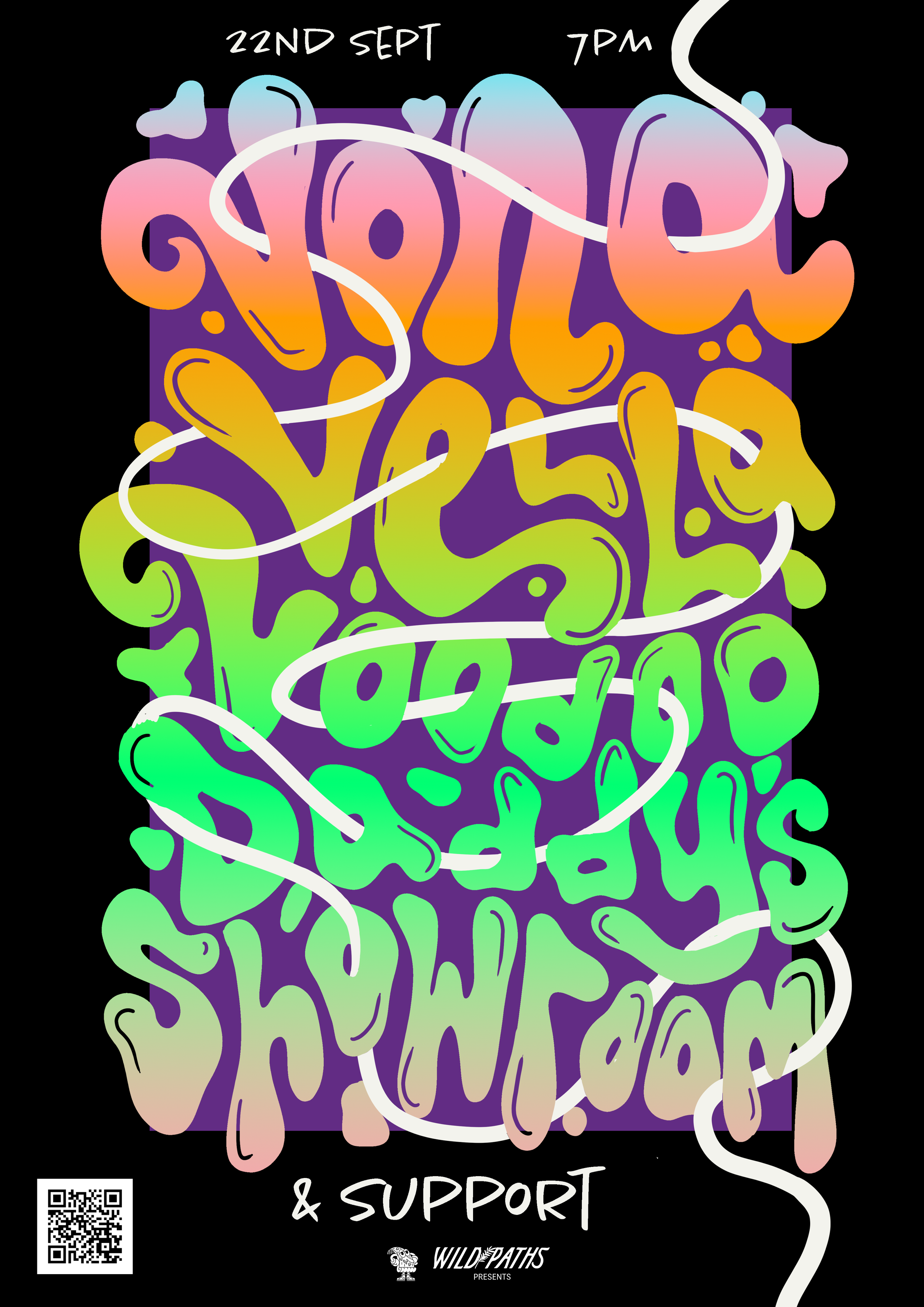 A collection of show posters designed for live music events, combining bold illustration, expressive typography, and strong colour palettes