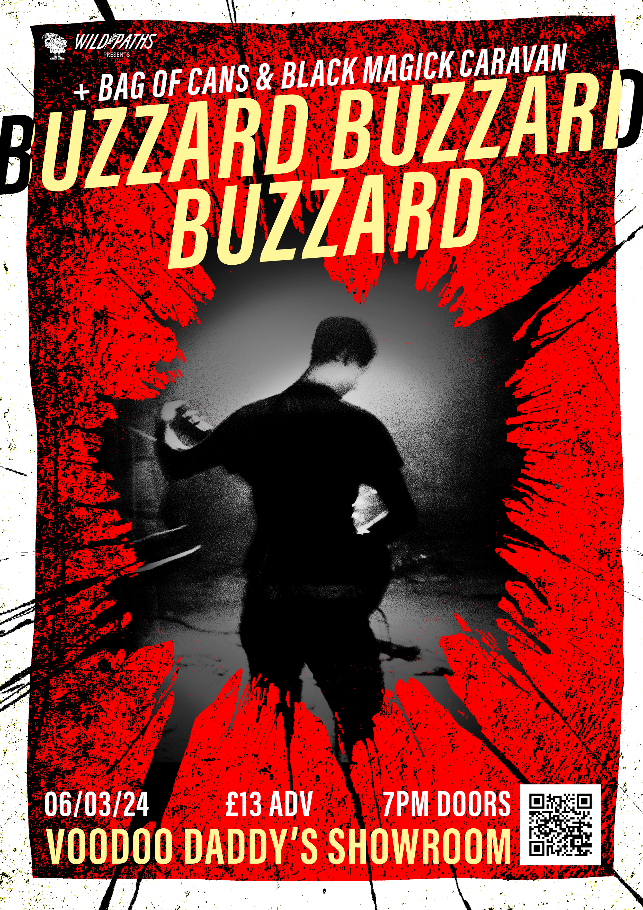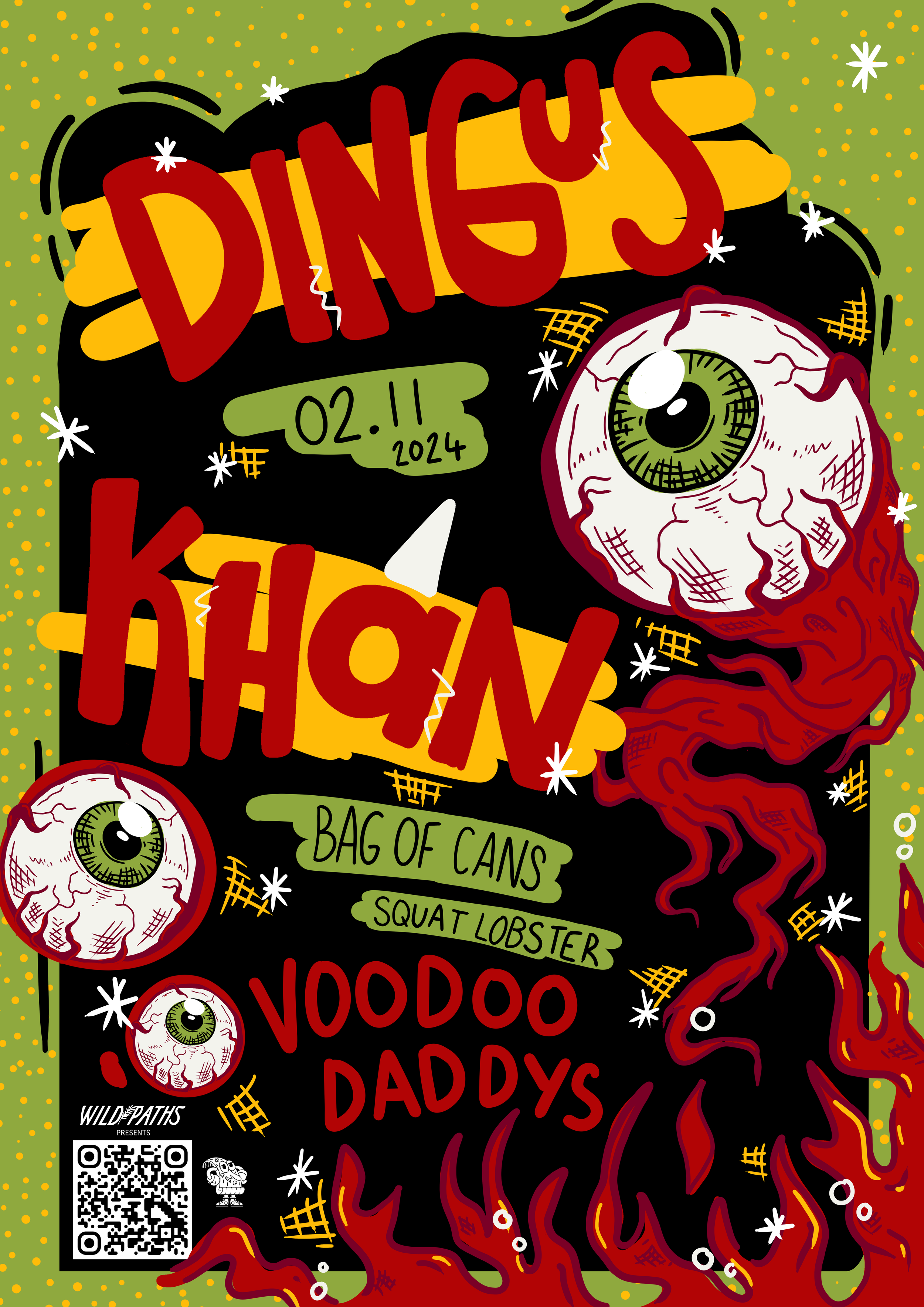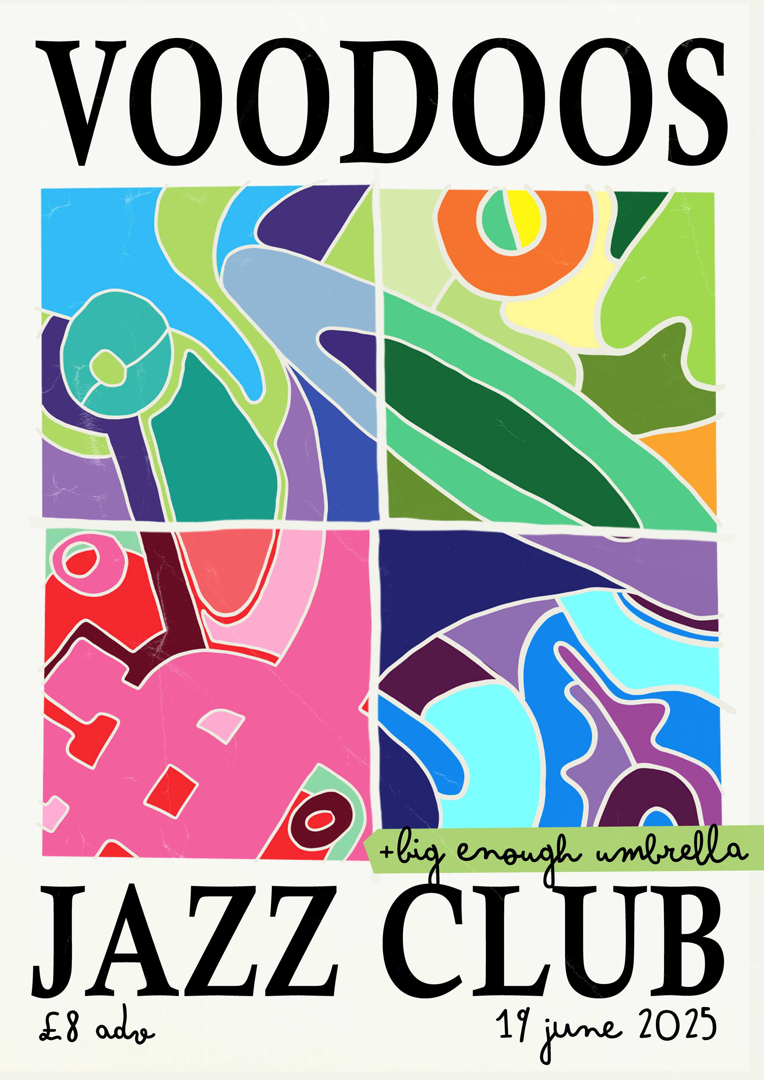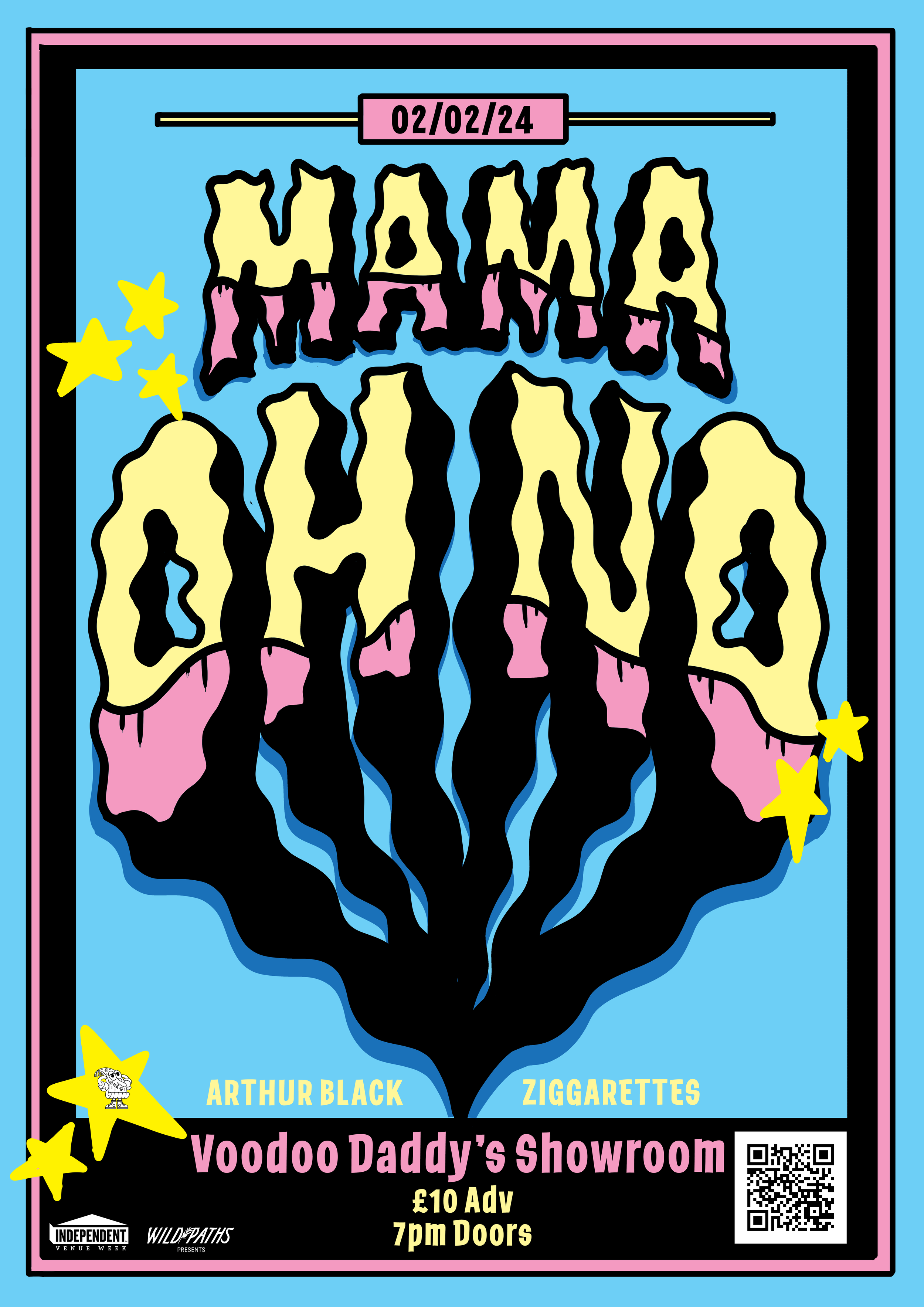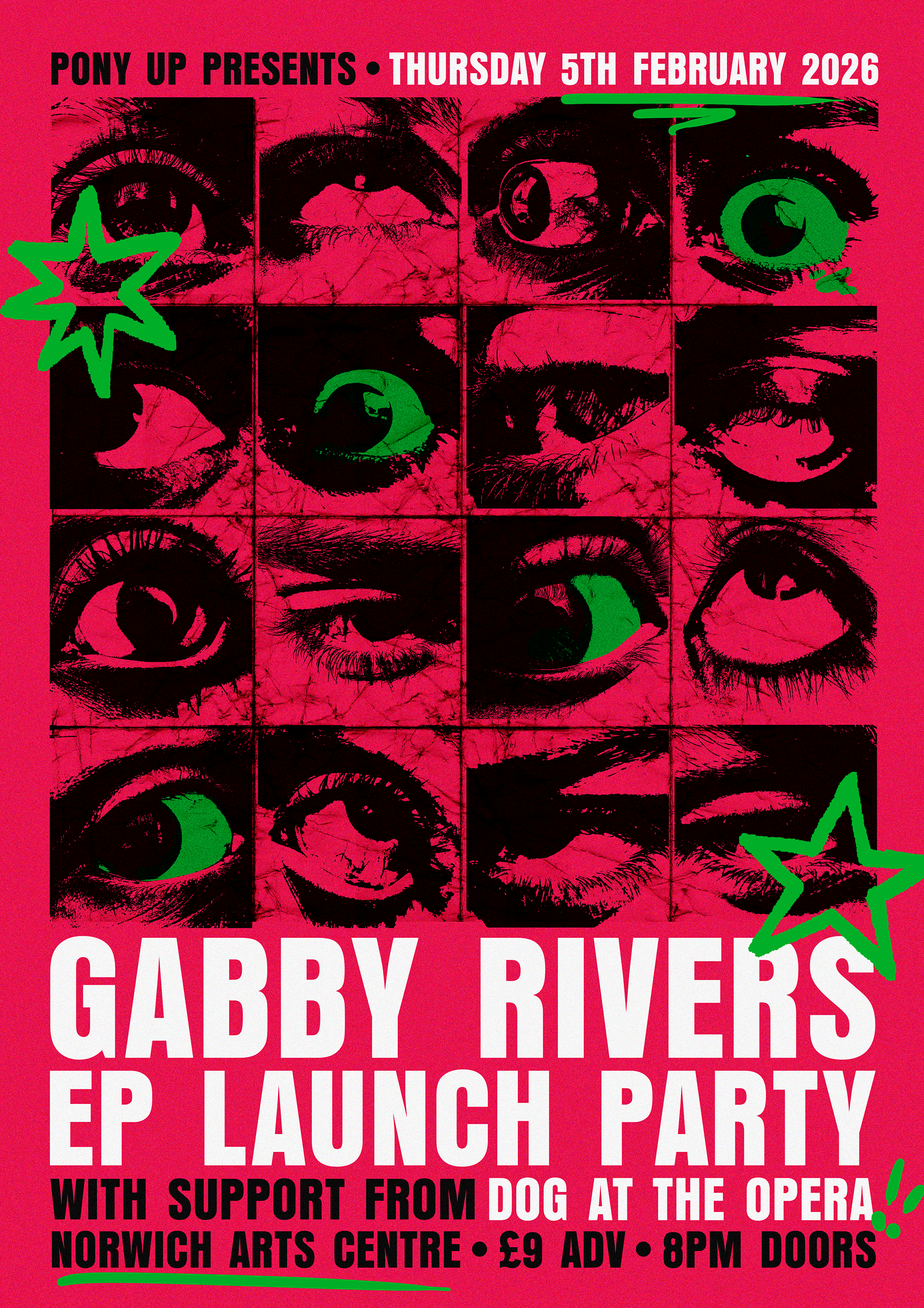 A collection of show posters designed for live music events, combining bold illustration, expressive typography, and strong colour palettes